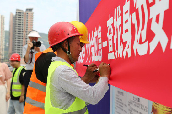 啟動儀式上,公司黨總支副書記、總經(jīng)理馮皓代表業(yè)主單位致辭,宣布安全生產(chǎn)月活動正式啟動。馮皓強調(diào)安全生產(chǎn)對項目建設(shè)的重要性,要求全體人員將安全理念貫穿工作始終,積極參與各項安全活動。并特別指出,張家河生態(tài)修復(fù)項目承載著改善區(qū)域生態(tài)環(huán)境、造福一方百姓的重要使命。作為項目業(yè)主,深知安全生產(chǎn)不僅是項目順利推進的基石、守護建設(shè)者生命安全的防線,更是踐行社會責任、保障生態(tài)修復(fù)事業(yè)高質(zhì)量發(fā)展的核心要義。隨后,施工單位代表領(lǐng)誓,宣讀了《安全生產(chǎn)誓詞》。緊接著,參與人員在“安全生產(chǎn)月”主題橫幅上簽名,以莊重的形式明確自身安全責任。